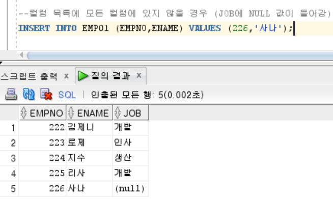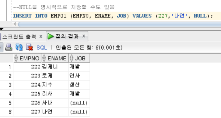 INSERT INTO EMP01 (EMPNO, ENAME, JOB) VALUES (227,'๋์ฐ', NULL);