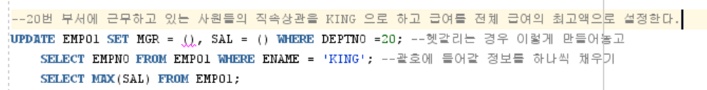 UPDATE EMP01 SET MGR = (), SAL = () WHERE DEPTNO =20; --ํท๊ฐ๋ฆฌ๋ ๊ฒฝ์ฐ ์ด๋ ๊ฒ ๋ง๋ค์ด๋๊ณ
