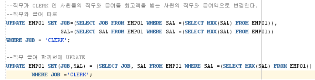 UPDATE UPDATE EMP01 SET(JOB,SAL) = (SELECT JOB, SAL FROM EMP01 WHERE SAL =(SELECT MAX(SAL) FROM EMP01))