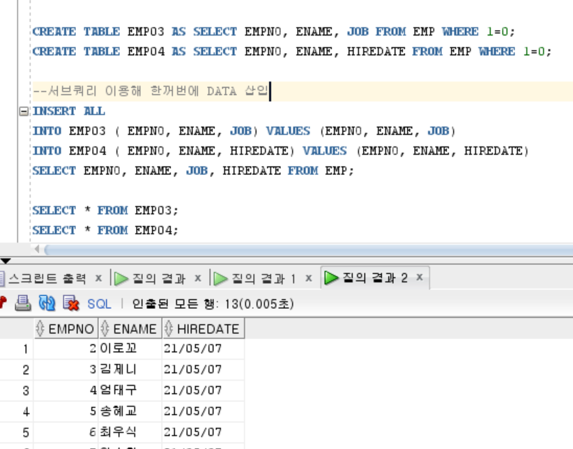 INSERT INTO ํ ์ด๋ธ๋ช ์๋ธ์ฟผ๋ฆฌ INSERT ALL INTO ํ ์ด๋ธ๋ช (์ปฌ๋ผ๋ช ) VALUES (์ปฌ๋ผ๋ช ) INTO ํ ์ด๋ธ๋ช (์ปฌ๋ผ๋ช ) VALUES(์ปฌ๋ผ๋ช ) ์๋ธ์ฟผ๋ฆฌ