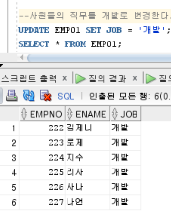 UPDATE EMP01 SET JOB = '๊ฐ๋ฐ'; SELECT * FROM EMP01;