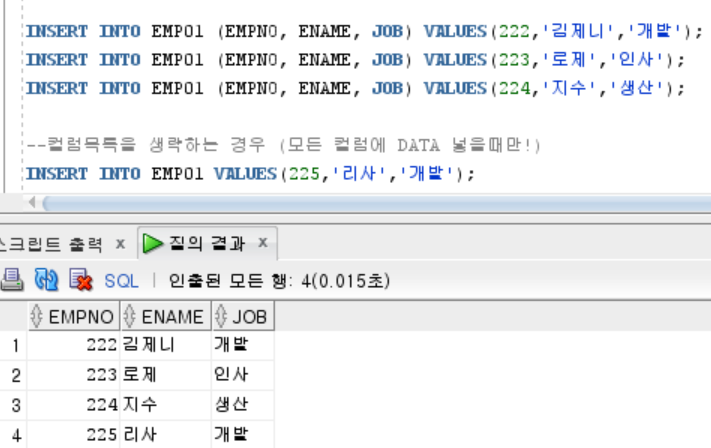 INSERT INTO EMP01 (EMPNO, ENAME, JOB) VALUES(224,'์ง์','์์ฐ');