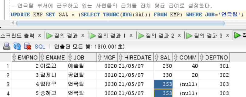 UPDATE EMP SET SAL = (SELECT TRUNC(AVG(SAL)) FROM EMP) WHERE JOB='์ฐ๊ทนํ';