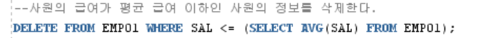 DELETE FROM EMP01 WHERE SAL <= (SELECT AVG(SAL) FROM EMP01);