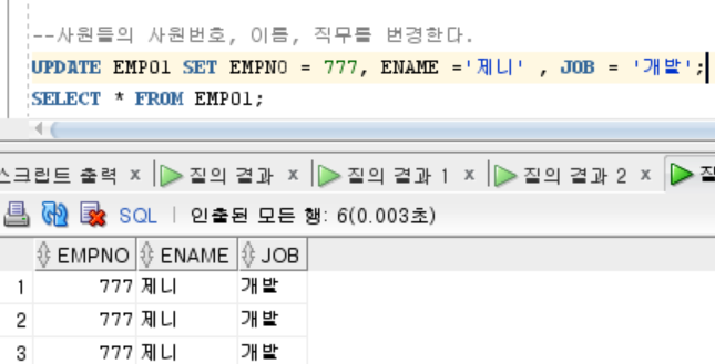 UPDATE EMP01 SET EMPNO = 777, ENAME ='์ ๋' , JOB = '๊ฐ๋ฐ';