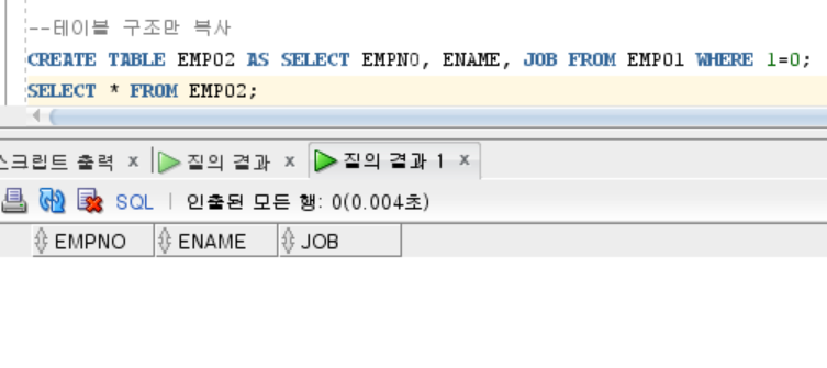 CREATE TABLE EMP02 AS SELECT EMPNO, ENAME, JOB FROM EMP01 WHERE 1=0;