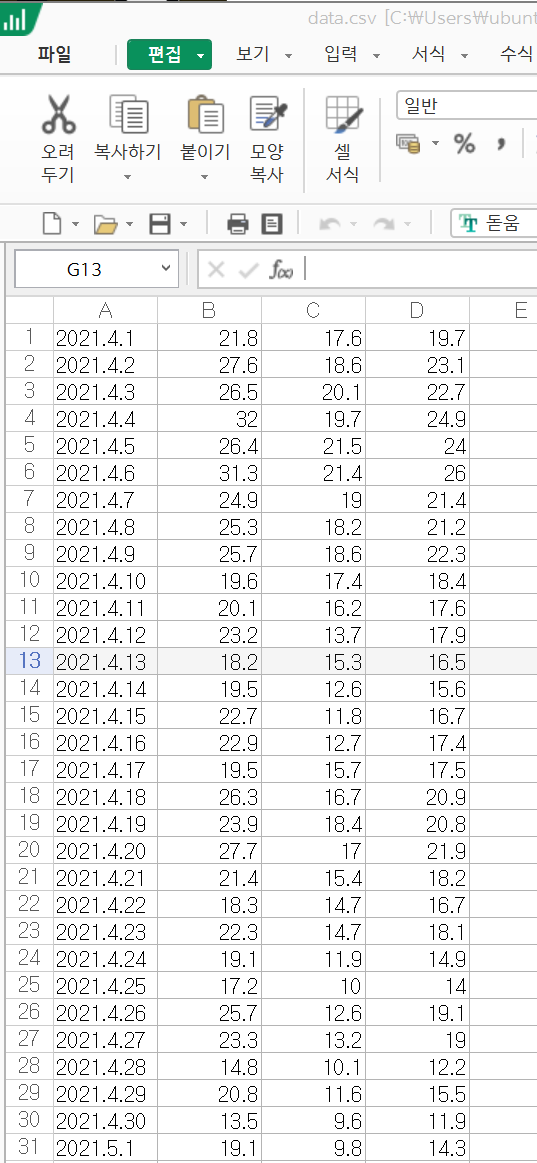 최고기온, 최저기온, 평균기온을 모두 똑같이 해놓고 날짜가 역순으로 정렬되는지 보려고 했는데,