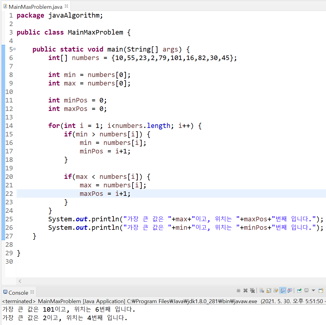 21 numbers[1]이 더 큰 값이므로 그 값을 최대값 변수에 넣어라. (오른쪽항에서 왼쪽항으로 대입)