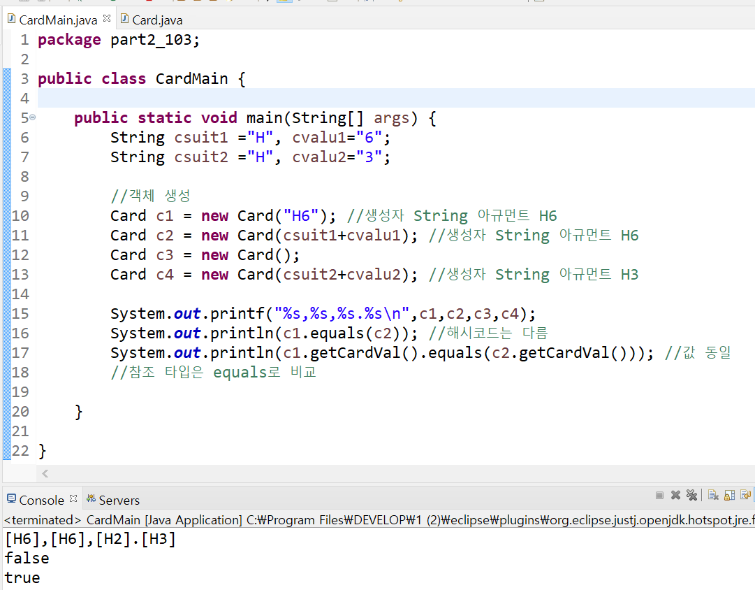 앞의 Card 는 class, 뒤의 Card 는 힙 메모리에 생성된 객체이며 Card 타입의 객체를 생성 한다는 의미다.