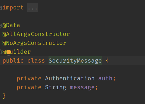 - SecurityMessage์์ auth์ ๋ํ ์ ๋ณด๋ฅผ Authentication ํ์ผ๋ก ์ง์ ํ๋ค.