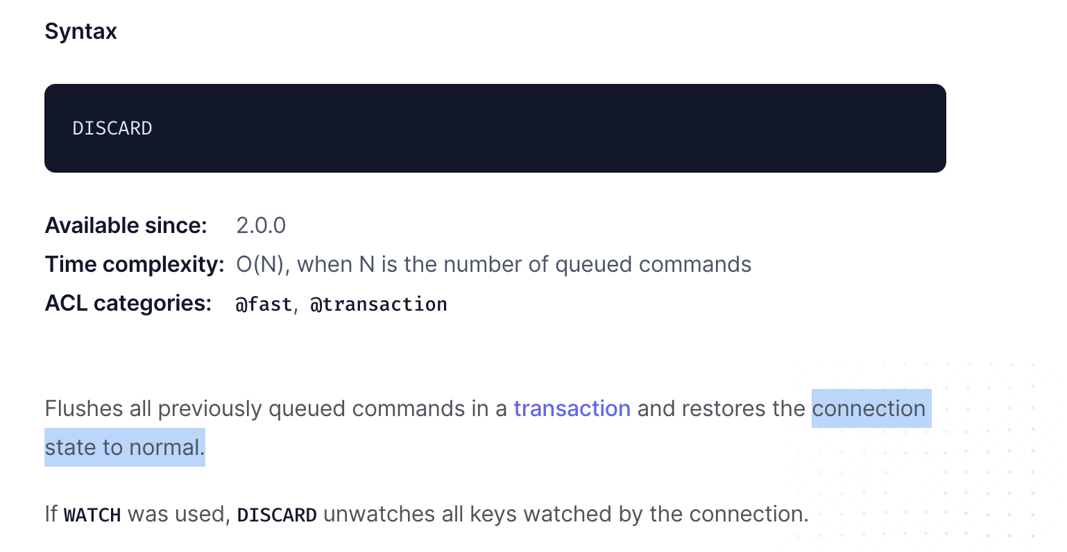 트랜잭션에 대한 롤백을 지원하지 않는다고 합니다. 그럼 discard 정체는 도대체 뭐란 말임.. discard 에 대한 설명도 공식문서에서 찾아보았습니다.