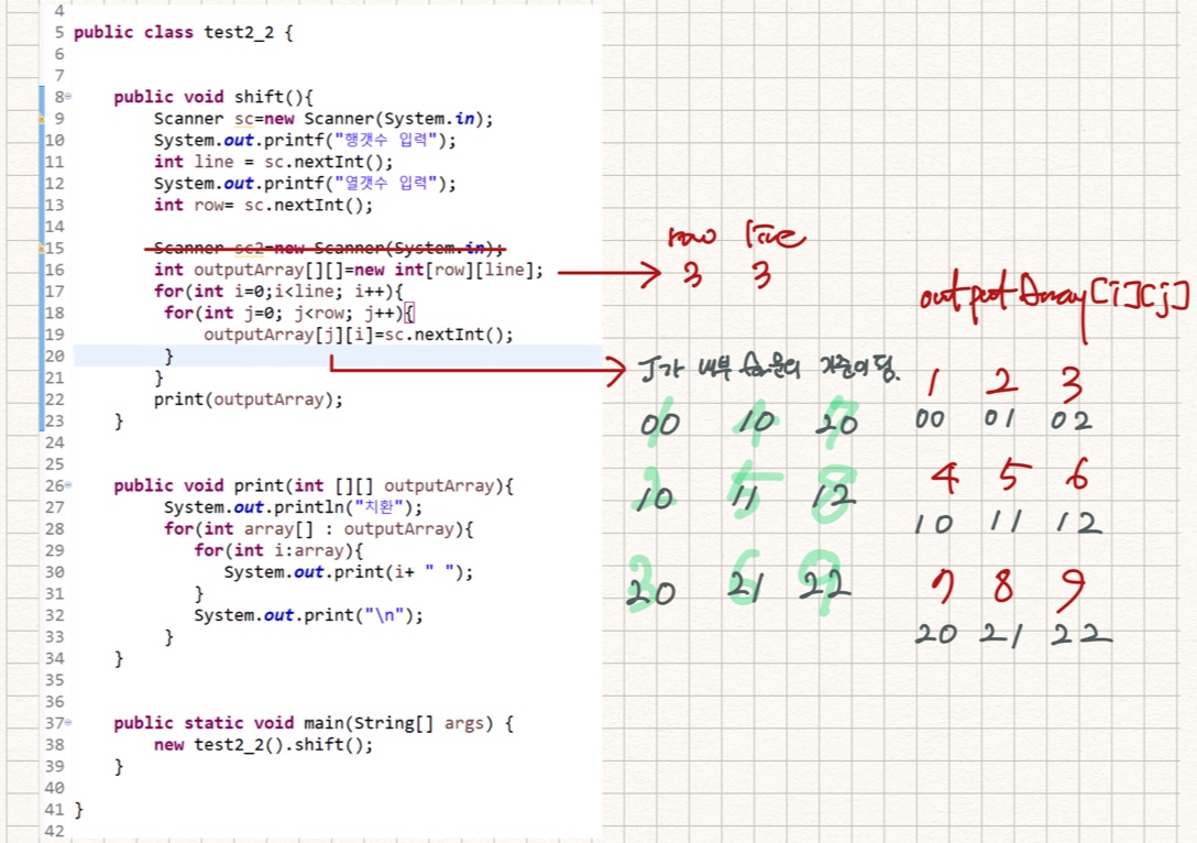 오른쪽 연두색 형광펜으로 쓴 부분은 outputArray[j][i]를 그려놓은 것