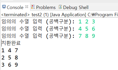 공백으로 구분 주어 1(공백)2(공백)3(공백) 식으로 받은 배열 3개를 열과 행의 위치를 바꾸어